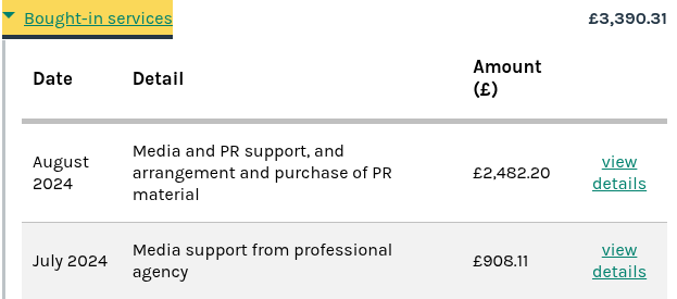 One claim of £908 was for “Media support from a professional agency,” and the other claim of £2,482 was for “Media support and PR materials”.
