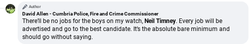 ON the campaign trail for the election last year, former Cumbrian policeman David Allen – Labour’s candidate for Cumbria’s Police, Fire and Crime Commissioner – told Facebook: “There’ll be no Jobs for the Boys on my watch.”