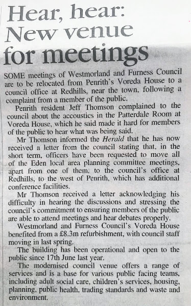 The Council has now agreed to move planning meetings lock, stock and barrel OUT of the new building, following a complaint submitted by exasperated and tireless Fresh Air for Penrith campaigner, Jeff Thomson, a one-man opposition force to the Council.