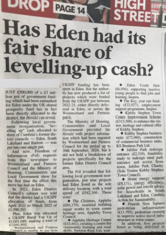 HAS Eden had its fair share of levelling-up cash? thundered Penrith snoozepaper The Slumberland & Westmoreland Imperilled in a page one ‘splash’ this week.