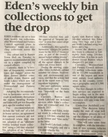 DROWSY Penrith snoozepaper — the Slumberland & Westmoreland Imperilled — has finally noticed that Wokemoreland & Farcical Council is binning WEEKLY rubbish collections.