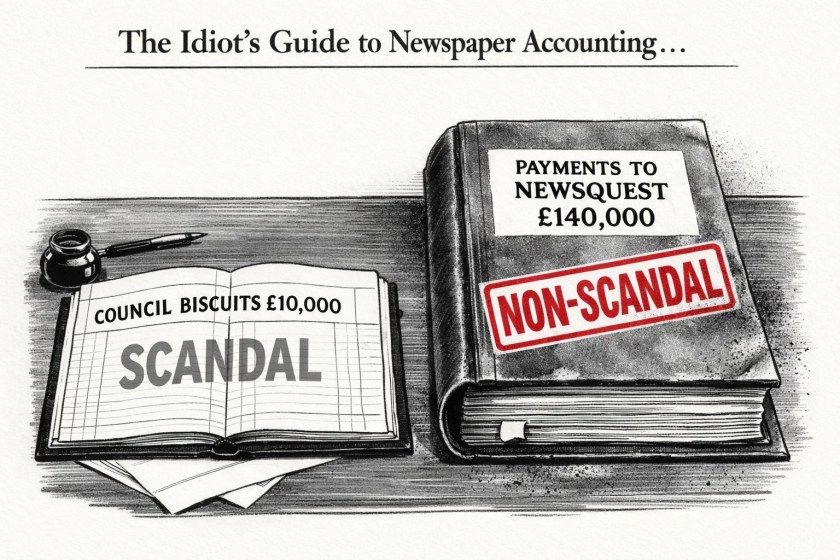 Scroogequest, which owns the, er, News & Shrug — whose adolescents now have the brass neck to slag off the council for daring to spend £10,000– on custard creams and PG Tips over TWO YEARS.