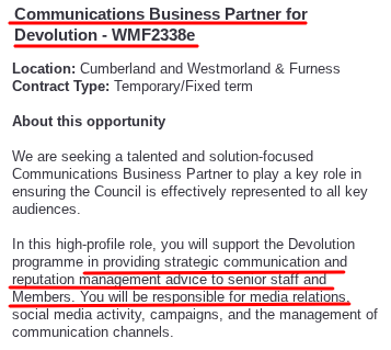 In other news, the new Spin Doctor job for the Cumbria Combined Authority has just gone to the highly-experienced Essex gal, Emily Woolfe.