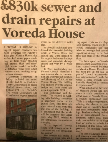 It was Penrith Town News that broke the exclusive earlier this week that Wokemoreland & Farcical Clowncil is spending £830,000 on repairs to its ‘new’ £8.3m Penrith headquarters, Voreda House.