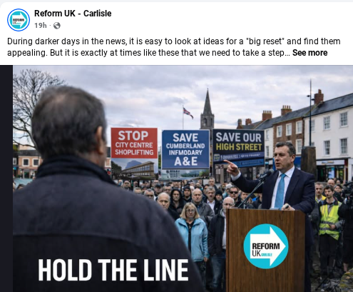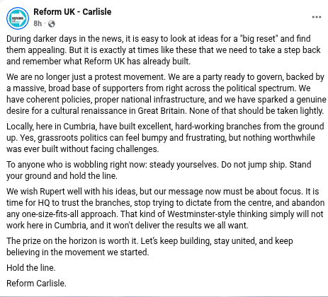 The Reform Carlisle page told its 989 followers: “To anyone who is wobbling right now: steady yourselves. Do not jump ship. Stand your ground and hold the line.”