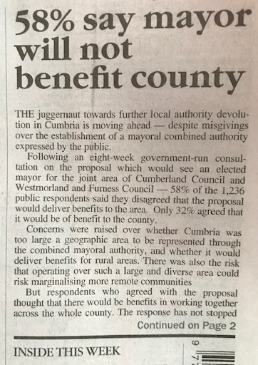Down in Penrith, the Slumberland & Westmoreland Imperilled “newspaper” finally spluttered into life to publish a story today about the public’s reaction to devolution and mayors.